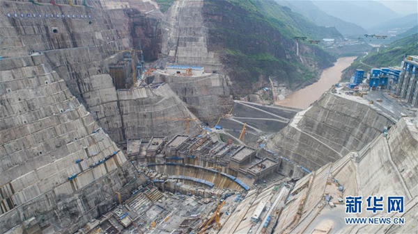 這是白鶴灘水電站建設(shè)工地(7月11日無(wú)人機(jī)拍攝)。 新華社記者 胡超 攝