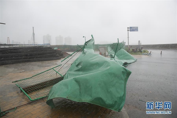 7月22日,在上海吳淞口國際郵輪碼頭,岸邊的防護(hù)欄被大風(fēng)吹垮。據(jù)上海中心氣象臺(tái)消息,今年第10號(hào)臺(tái)風(fēng)“安比”(強(qiáng)熱帶風(fēng)暴級(jí))的中心已于7月22日12時(shí)30分在上海崇明東部登陸,登陸時(shí)中心附近最大風(fēng)力有10級(jí)(28米/秒),中心最低氣壓982百帕,登陸后繼續(xù)向西北方向移動(dòng),強(qiáng)度逐漸減弱。新華社記者丁汀攝