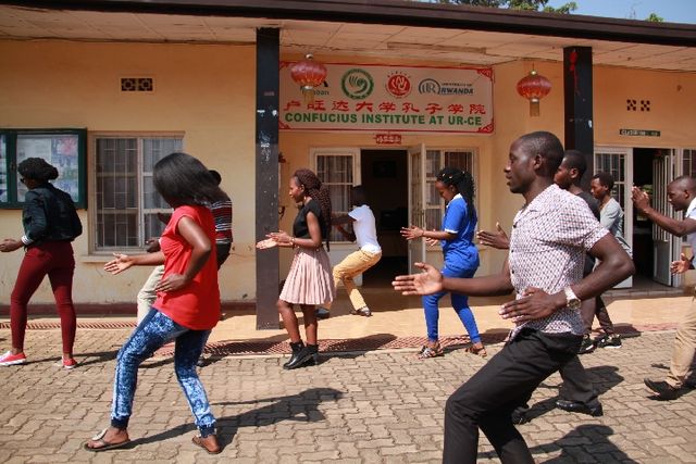 盧旺達(dá)大學(xué)孔子學(xué)院學(xué)生在打太極拳。新華社記者 張改萍攝