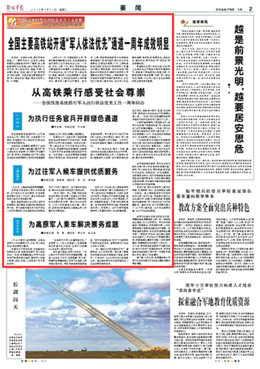 去年8月1日,中國(guó)鐵路總公司、軍委后勤保障部聯(lián)合決定,在全國(guó)鐵路系統(tǒng)開(kāi)展軍人出行依法優(yōu)先工作。這項(xiàng)政策實(shí)施一年來(lái)成效如何?記者走進(jìn)高鐵站進(jìn)行了采訪調(diào)查,實(shí)地探訪“軍人依法優(yōu)先”給官兵出行帶來(lái)的新變化。請(qǐng)關(guān)注今天出版的《解放軍報(bào)》的報(bào)道——