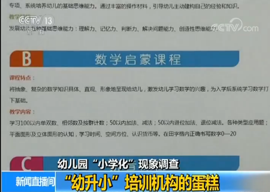 在北京另外一家培訓(xùn)機(jī)構(gòu)的學(xué)前班的招生廣告上,記者看到這個(gè)面向5—6歲兒童的全日制學(xué)前班,其教學(xué)內(nèi)容包括:學(xué)習(xí)100以內(nèi)單雙數(shù)、相鄰數(shù)及按群計(jì)數(shù),50以內(nèi)加減法、各種類型應(yīng)用題、認(rèn)讀聲母單韻母復(fù)韻母,整體認(rèn)讀音節(jié)等。同時(shí)包括數(shù)學(xué)啟蒙、思維訓(xùn)練等課程。所有涉及小學(xué)一年級(jí)課程學(xué)習(xí)內(nèi)容課程基本都能在機(jī)構(gòu)學(xué)前班找到,有的培訓(xùn)機(jī)構(gòu)的課程種類甚至達(dá)到數(shù)十種。