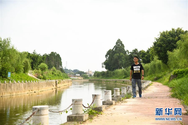 廣東省鶴山市“民間河長”趙德光在桃源河畔巡河(7月12日攝)。新華社記者 鄧華 攝