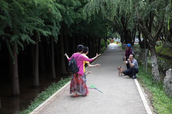 7月21日,游客在滇池東岸撈魚河濕地公園留影。 云南省昆明市撈魚河濕地公園位于滇池東岸。近年來,通過當?shù)卣母脑旌椭卫?,撈魚河濕地公園整體環(huán)境得到明顯改善。 新華社記者 金立旺 攝
