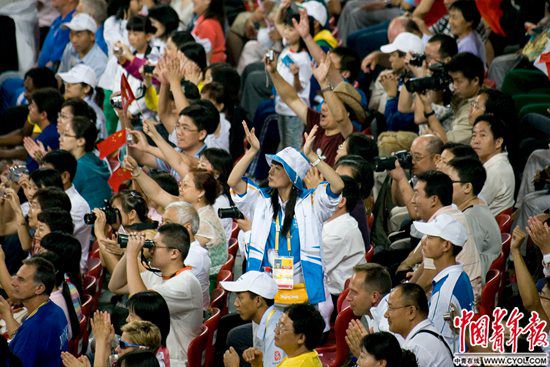 2008年8月21日,國(guó)家體育場(chǎng)“鳥(niǎo)巢”,志愿者帶領(lǐng)觀眾為運(yùn)動(dòng)員鼓掌。中國(guó)青年報(bào)·中青在線記者 陳劍/攝