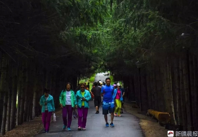 烏蘇佛山國家森林公園待甫僧景區(qū),游客走在綠蔭小道上。圖/新疆經(jīng)濟(jì)報新媒體中心記者 豆興軍