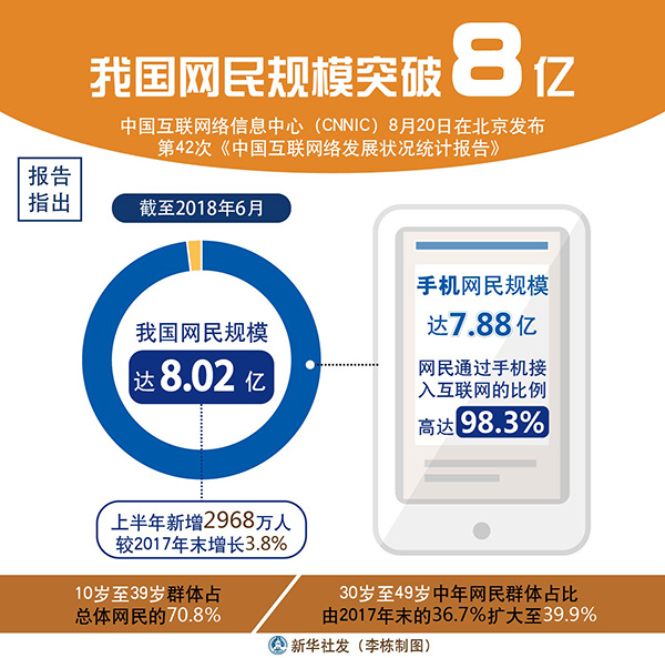 新華社北京8月20日電(記者王思北、施雨岑)中國互聯(lián)網(wǎng)絡(luò)信息中心(CNNIC)20日在京發(fā)布第42次《中國互聯(lián)網(wǎng)絡(luò)發(fā)展?fàn)顩r統(tǒng)計(jì)報(bào)告》。報(bào)告指出,截至2018年6月,我國網(wǎng)民規(guī)模達(dá)8.02億,上半年新增網(wǎng)民2968萬人,較2017年末增長3.8%,互聯(lián)網(wǎng)普及率達(dá)57.7%;手機(jī)網(wǎng)民規(guī)模達(dá)7.88億,網(wǎng)民通過手機(jī)接入互聯(lián)網(wǎng)的比例高達(dá)98.3%。