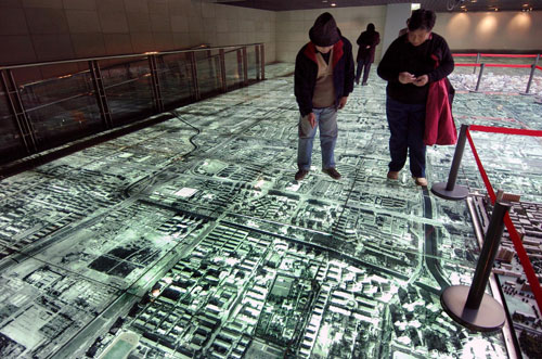 兩位北京市民在北京市規(guī)劃展覽館的城市模型上尋找自己家的位置 王建華 攝