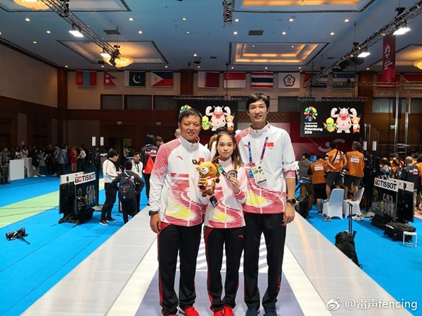 雷聲與獲得亞運(yùn)會(huì)女花個(gè)人銀牌的傅依婷。