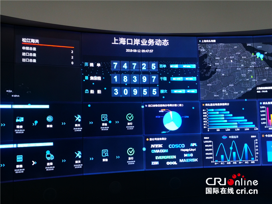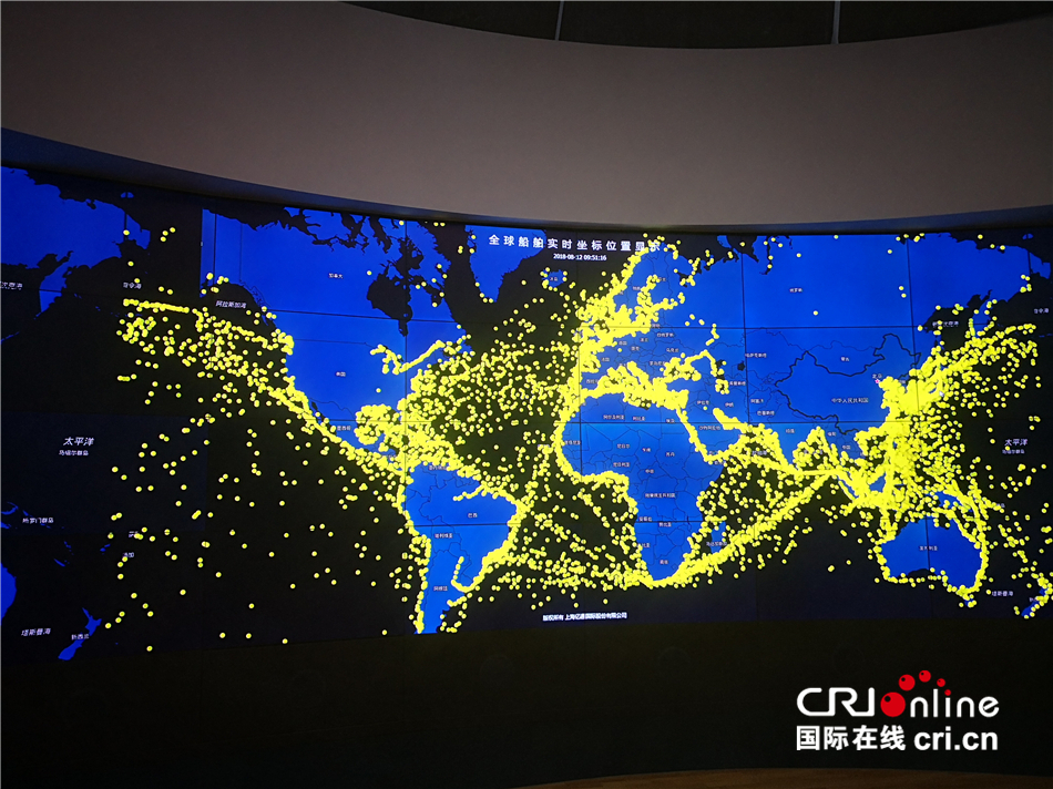 在上海國際貿易單一窗口運營方、上海億通公司的電子大屏上,密密麻麻的黃色光點顯示著全球船舶的實時坐標位置、上??诎稑I(yè)務動態(tài)等關鍵信息。