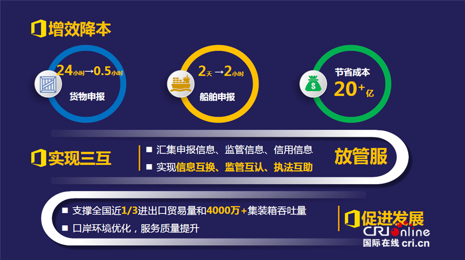 國際貿易單一窗口的運營,為貿易船舶進出上海港大大節(jié)約了時間和成本。辦通關手續(xù)實現了從“人跑路”向“信息跑路”的轉變,提交的資料由四套系統1113項數據簡化為一套系統388個數據,船舶進出港環(huán)節(jié)全流程從原來的2天縮短至2小時,貨物進出口申報環(huán)節(jié)全流程從24小時縮短至半個小時。