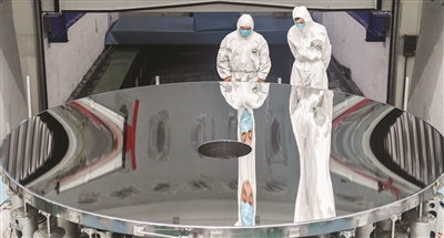 科研人員檢查4米量級(jí)高精度碳化硅非球面反射鏡表面情況。
