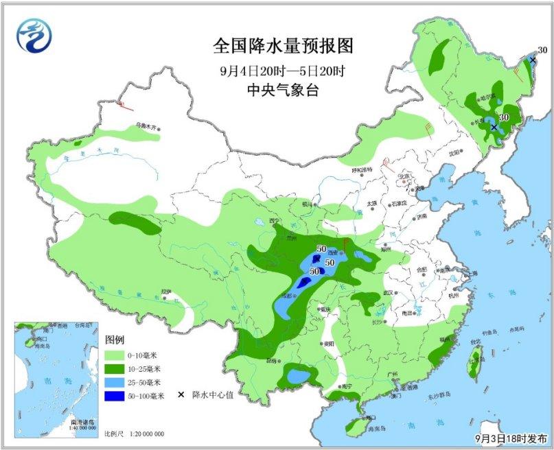 受東移南下冷空氣影響,9月3日夜間至4日,內(nèi)蒙古東部、東北、江南等地將有小到中雨,其中內(nèi)蒙古東北部和東北地區(qū)中北部等地的部分地區(qū)將有大雨。內(nèi)蒙古中東部、東北地區(qū)西部、華北、黃淮、江淮等地有4~6℃降溫。