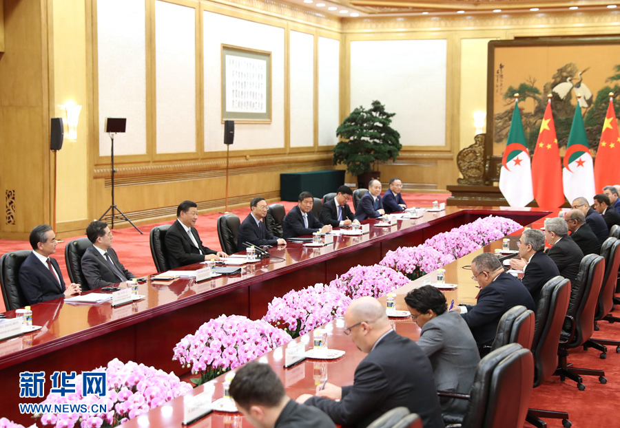 烏葉海亞表示,昨天,我向布特弗利卡總統(tǒng)報告了北京峰會的盛況。他讓我轉(zhuǎn)達對習近平主席的熱烈祝賀以及對中國支持非洲的衷心感謝。烏葉海亞表示,阿中關(guān)系歷史悠久。阿爾及利亞在爭取民族獨立和實現(xiàn)國家發(fā)展中得到中方寶貴支持,雙方在國際事務中一直緊密配合。阿方贊賞并支持北京峰會提出的中非合作新舉措,愿以此次雙方簽署“一帶一路”合作協(xié)議為契機,深化雙方務實合作。