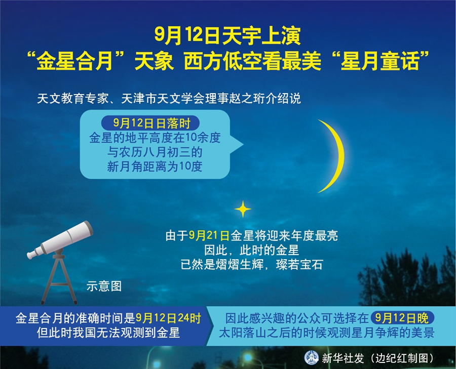 新華社天津9月10日電(記者周潤(rùn)?。┨煳膶?zhuān)家介紹說(shuō),作為行星合月里最美的一幕“星月童話”,“金星合月”12日晚將現(xiàn)身天宇,映美蒼穹。如果天氣晴好,感興趣的公眾抬頭仰望西方低空,憑借肉眼就可欣賞到“維納斯”與“月姑娘”相依相伴的美妙場(chǎng)景。