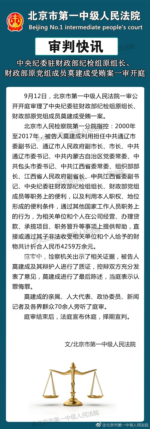 據(jù)北京市第一中級(jí)人民法院官方微博消息,9月12日,北京市第一中級(jí)人民法院一審公開開庭審理了中央紀(jì)委駐財(cái)政部紀(jì)檢組原組長、財(cái)政部原黨組成員莫建成受賄一案。