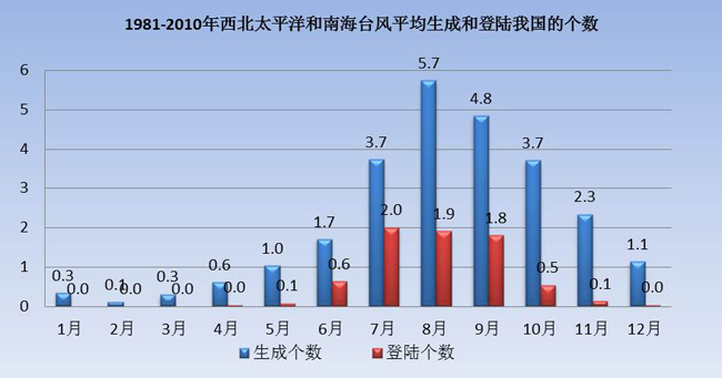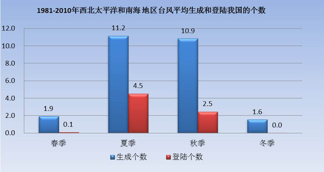 圖1 1981-2010年西北太平洋和南海臺(tái)風(fēng)平均生成和登陸我國(guó)個(gè)數(shù) 李慧 制圖