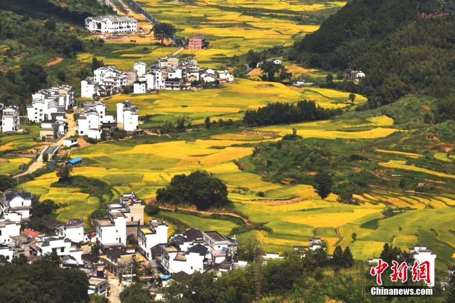 9月13日,在“中國最美鄉(xiāng)村”的江西婺源縣,正值收獲期的金黃水稻與周邊建筑構成了一幅美好的田園豐收圖卷。中新社發(fā) 曹加祥 攝