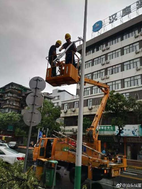 ▲臺風來臨之際,汕頭市城照中心的工作人員,正在對被風吹倒的路燈進行應急處置。