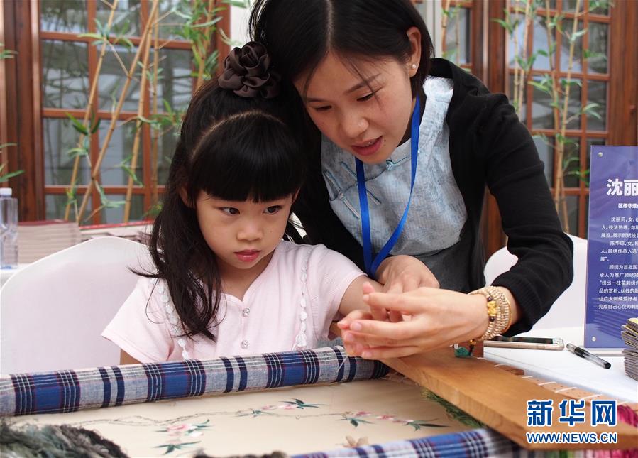 一位小女孩體驗國家級非物質(zhì)文化遺產(chǎn)“顧繡”針法