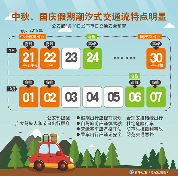 公安部分析近5年中秋、國慶期間道路交通事故規(guī)律特點(diǎn),對今年“兩節(jié)”期間道路交通安全形勢進(jìn)行了分析研判,預(yù)計(jì)今年中秋假期出行高峰為假期前一日(9月21日)下午至午夜及假期首日(9月22日)上午,返程高峰為假期最后一天(9月24日)。國慶節(jié)出行高峰從9月30日下午開始至10月2日,返程高峰在10月6日至7日。