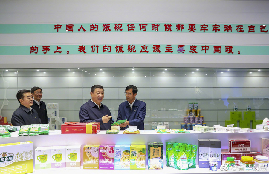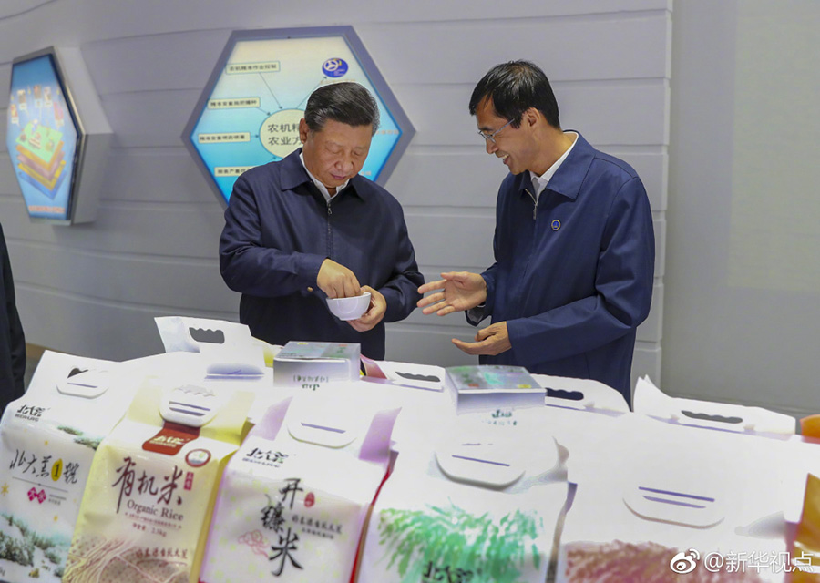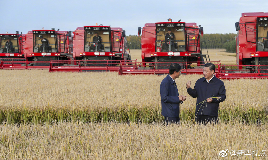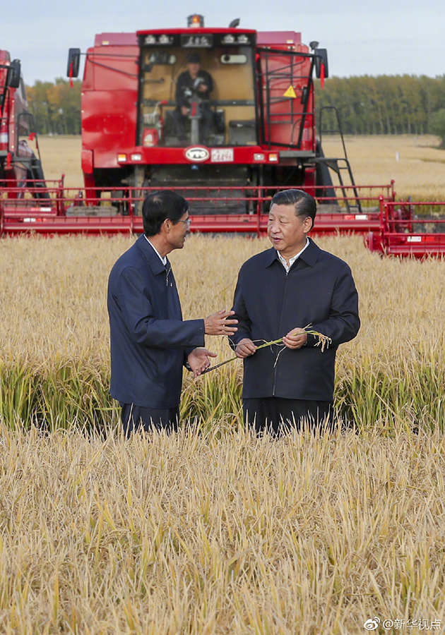 25日下午,首個(gè)“中國(guó)農(nóng)民豐收節(jié)”剛過,習(xí)近平就深入三江平原腹地黑龍江農(nóng)墾建三江管理局,考察糧食生產(chǎn)和收獲情況。他邊聽介紹,邊向農(nóng)場(chǎng)負(fù)責(zé)人詢問今年收成如何、有沒有病蟲害、能否做到連年豐收,并強(qiáng)調(diào)中國(guó)人的飯碗任何時(shí)候都要牢牢端在自己的手上。在北大荒精準(zhǔn)農(nóng)業(yè)農(nóng)機(jī)中心一樓大廳,當(dāng)?shù)爻霎a(chǎn)的米油豆奶等各類農(nóng)產(chǎn)品擺滿展臺(tái)。習(xí)近平走近前去,雙手捧起一碗大米,意味深長(zhǎng)地說:“中國(guó)糧食,中國(guó)飯碗?!保ㄎ淖郑簭垥运?攝影:謝環(huán)馳)