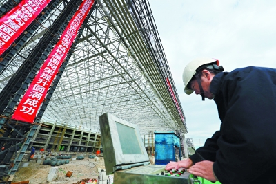 “機(jī)庫(kù)大廳平面長(zhǎng)147米、寬99.7米,網(wǎng)架總重約1600噸,是此次整體提升的重點(diǎn)所在?!北本┙üとü卷?xiàng)目負(fù)責(zé)人介紹,針對(duì)工程的技術(shù)難度和跨度,項(xiàng)目團(tuán)隊(duì)采用了“地面拼裝+整體提升”的方法完成鋼屋蓋網(wǎng)架提升,先用吊車將各個(gè)拼裝單元在機(jī)庫(kù)地面上對(duì)應(yīng)的投影位置進(jìn)行組裝,隨后利用提升支架將完成拼裝的屋架整體提升。9月25日,工程首先啟動(dòng)歷時(shí)1小時(shí)左右的預(yù)提升,將大廳網(wǎng)架提升至0.4米。1天后,正式啟動(dòng)整體提升,提升高度22米,平均提升速度達(dá)2-3米/小時(shí)。截止到今天上午,鋼屋蓋全部提升到位,代表著東航基地機(jī)庫(kù)完成封頂。