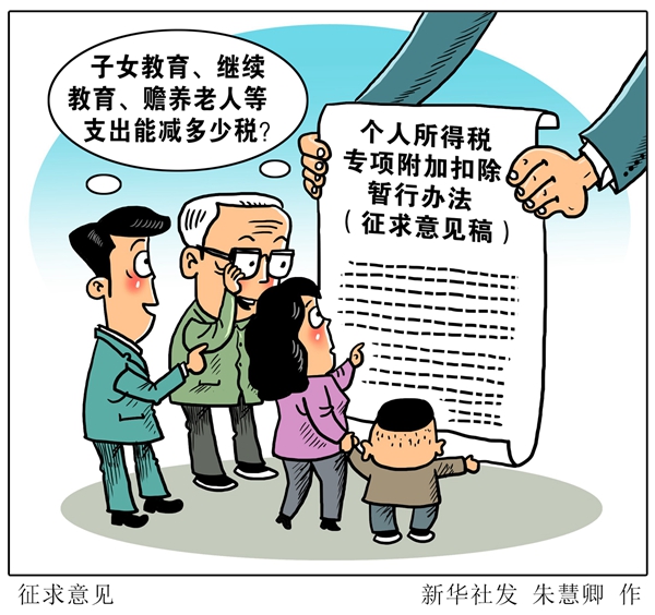 新華社北京10月20日電(記者 韓潔、劉紅霞)新一輪個(gè)人所得稅改革的一大亮點(diǎn)——專項(xiàng)附加扣除政策20日揭開面紗。當(dāng)天起,財(cái)政部、國家稅務(wù)總局會(huì)同有關(guān)部門起草的《個(gè)人所得稅專項(xiàng)附加扣除暫行辦法(征求意見稿)》在兩部門官網(wǎng)開始為期兩周的向全社會(huì)公開征求意見。