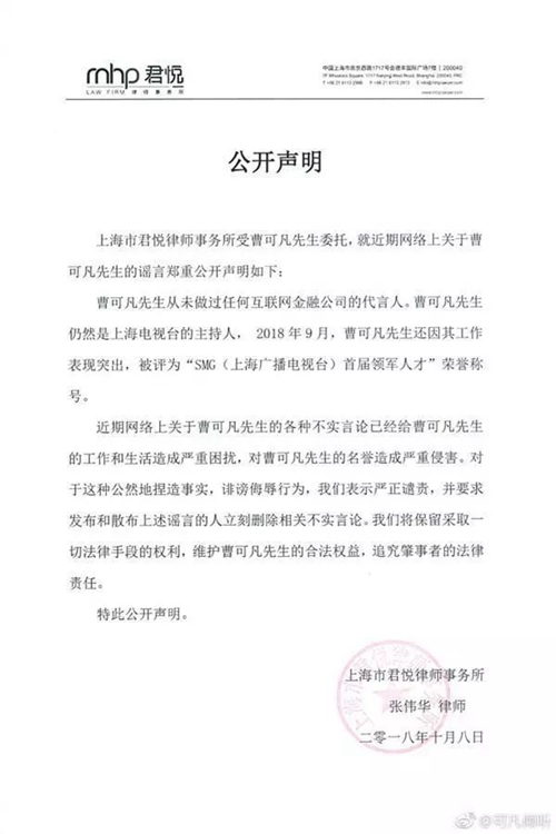 但事實上,主持人曹可凡國慶節(jié)前后多次參加公眾活動,國慶期間也曾發(fā)布過微博。但這些都沒能有效阻止謠言傳播,最終還是靠曹可凡本人委托的一封律師函,方才真相大白。