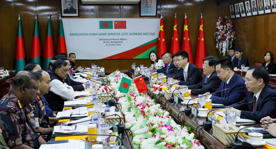中國駐孟加拉國大使張佐,國務(wù)院副秘書長孟揚(yáng),公安部副部長、國家移民管理局局長許甘露,孟加拉國內(nèi)政部常秘烏丁、裘德瑞,警察總監(jiān)帕特瓦瑞參加會談。(圖:滿博)
