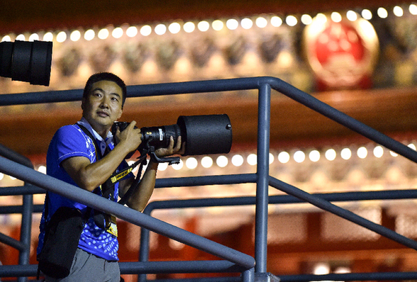 圖為2015年9月3日,羅曉光在天安門(mén)城樓前金水橋上的點(diǎn)位等候幾個(gè)小時(shí)后將進(jìn)行的閱兵。