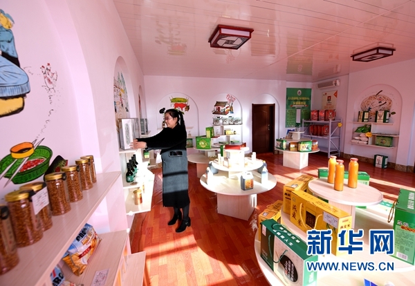 在山西省右玉縣殺虎口村,村民王彩霞在殺虎口村生態(tài)旅游專業(yè)合作社內(nèi)整理當(dāng)?shù)靥禺a(chǎn)(10月25日攝)。新華社記者 楊晨光攝