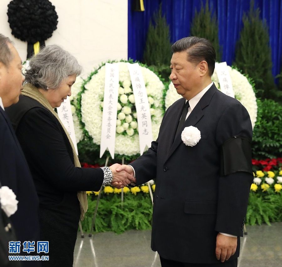 上午9時30分許,習近平、李克強、栗戰(zhàn)書、汪洋、王滬寧、趙樂際、韓正、王岐山、胡錦濤等,在哀樂聲中緩步來到王光英同志的遺體前肅立默哀,向王光英同志的遺體三鞠躬,并與王光英同志親屬一一握手,表示慰問。