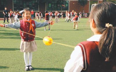 武漢市紅領(lǐng)巾學(xué)校學(xué)生在操場上分組玩“穿梭拉拉球”游戲。本報(bào)記者 田豆豆攝