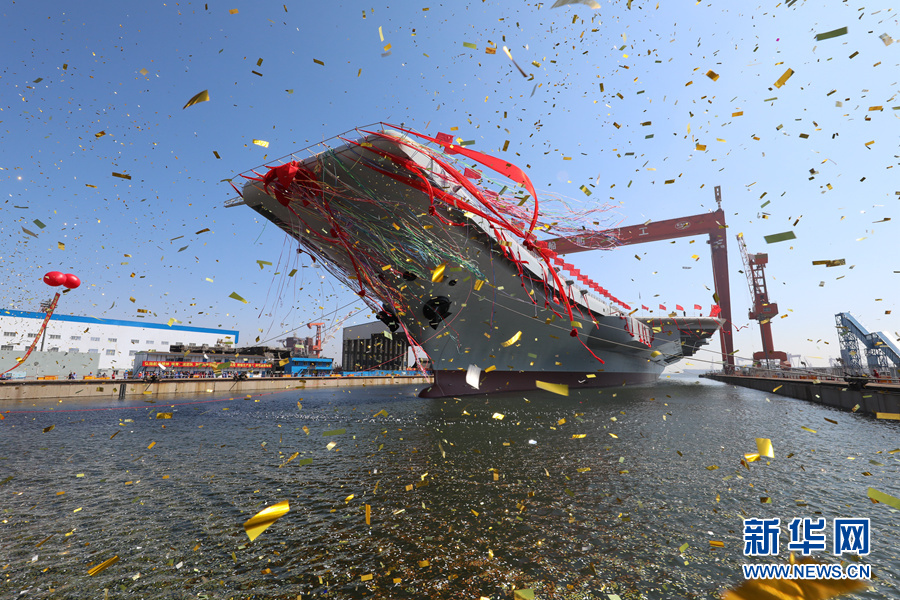 我國(guó)第二艘航空母艦下水儀式在中國(guó)船舶重工集團(tuán)公司大連造船廠舉行(2017年4月26日攝)。 新華社記者 李剛 攝