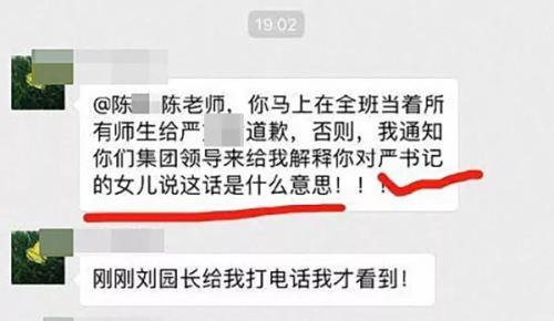 隨后,群內署名為“嚴某某媽媽”的人士發(fā)言稱,“陳老師,你馬上在全班當著所有師生給嚴某某道歉,否則,我通知你們集團領導來給我解釋你對嚴書記的女兒說這話是什么意思!”后又稱學校已將該老師開除。