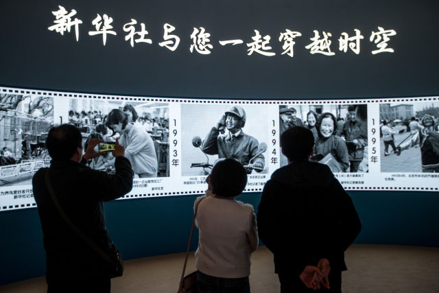兩名參觀者在“時光博物館”里的年代照相館拍照留念。
