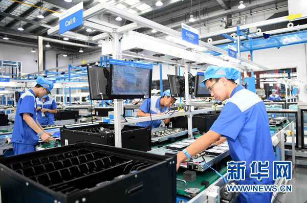 員工們?cè)诶顺备叨巳蒎e(cuò)計(jì)算機(jī)產(chǎn)業(yè)基地生產(chǎn)服務(wù)器(6月14日攝)。新華社記者 朱崢攝