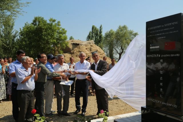 2016年6月19日,中烏聯(lián)合發(fā)掘明鐵佩遺址的紀念碑揭牌。(中國社科院考古所供圖)