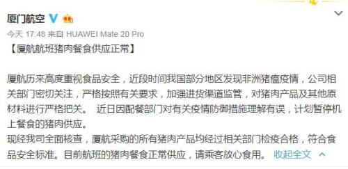 廈門(mén)航空24日在官方微博發(fā)布消息稱(chēng),廈航航班豬肉餐食供應(yīng)正常,其采購(gòu)的所有豬肉產(chǎn)品均經(jīng)過(guò)相關(guān)部門(mén)檢疫合格,符合食品安全標(biāo)準(zhǔn)。