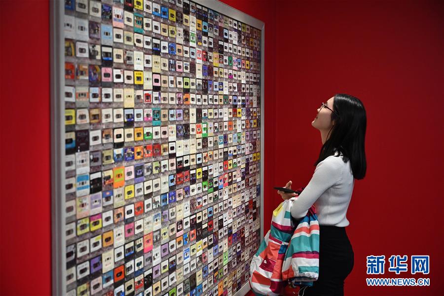 一名參觀者在“時(shí)光博物館”里觀看懷舊磁帶墻。 新華社記者李鑫 攝