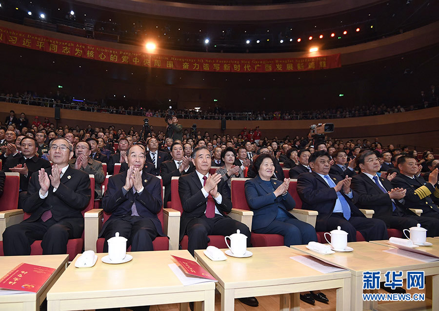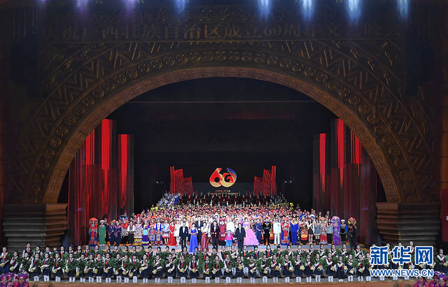 12月9日,慶祝廣西壯族自治區(qū)成立60周年文藝晚會《壯志飛揚》在廣西文化藝術(shù)中心精彩上演。中共中央政治局常委、全國政協(xié)主席、中央代表團(tuán)團(tuán)長汪洋和各族各界干部群眾等近900人觀看演出。 新華社記者 申宏 攝