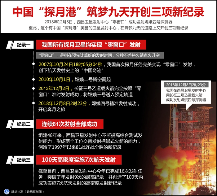 2018年12月8日,西昌衛(wèi)星發(fā)射中心“零窗口”成功發(fā)射嫦娥四號探測器。至此,這個有中國“探月港”美譽(yù)的衛(wèi)星發(fā)射中心,在筑夢九天的道路上又開創(chuàng)三項(xiàng)新紀(jì)錄。