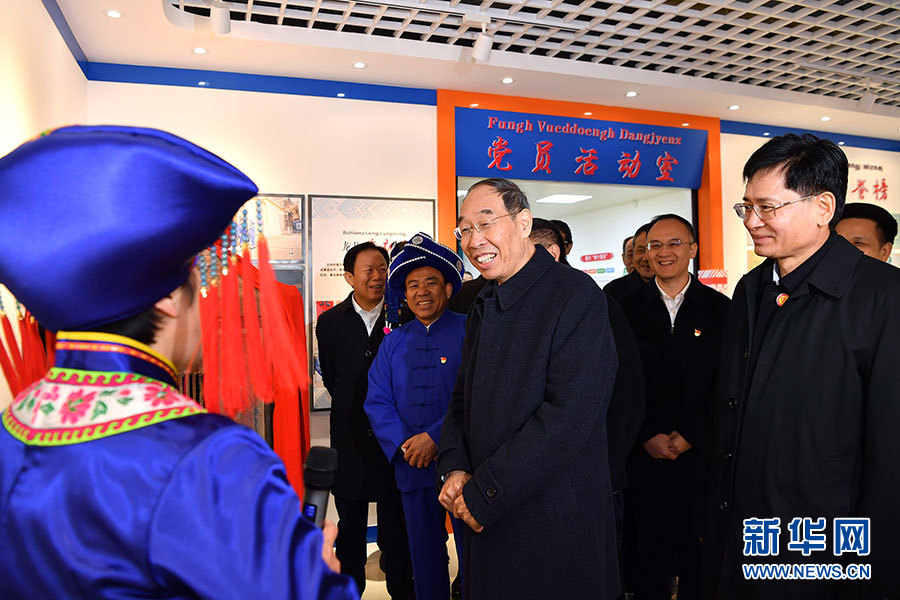 在港北區(qū)港城街道龍井村,尤權(quán)考察了村委辦公樓、便民服務(wù)大廳、壯族文化展館,聽取民族團(tuán)結(jié)進(jìn)步創(chuàng)建等情況介紹,與少數(shù)民族群眾親切交談,祝愿他們?nèi)兆右惶毂纫惶旌?,生活越來越幸福?/p>