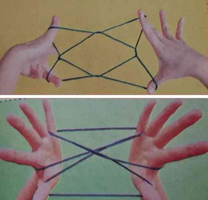 用一根繩子結(jié)成繩套,一人以手指編成一種花樣,另一人用手指接過(guò)來(lái),翻成另一種花樣,相互交替編翻,直到一方不能再編翻下去為止。這個(gè)游戲最大的樂(lè)趣在于翻出新花樣,展現(xiàn)自己的聰明才智。