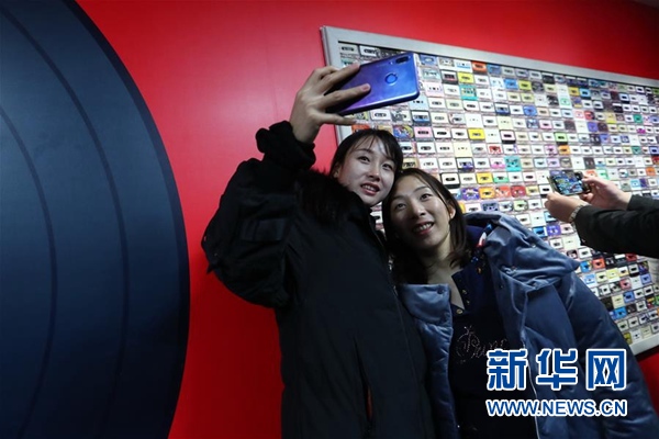 參觀者用手機為兩名小朋友在“時光博物館”內留影。