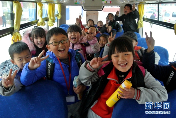 照金北梁紅軍小學學生在校車上合影(12月4日攝)。 新華社記者 梁愛平 攝