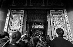 此次展覽從臘月初一展至三月初三,為期三個月,分為文物展覽和實(shí)景體驗(yàn)兩部分。文物展覽位于午門正殿和東西雁翅樓展廳,共展出文物885件(套)。實(shí)景體驗(yàn)部分包括整個紫禁城開放區(qū)域,都成為春節(jié)文化的展場,在宮殿門口會懸掛著寓意吉祥的春聯(lián)、門神(上圖),在廊廡下裝飾著華美的宮燈,在乾清宮的丹陛上下豎立著高大的天燈、萬壽燈,總共使用仿制品超過1000件。