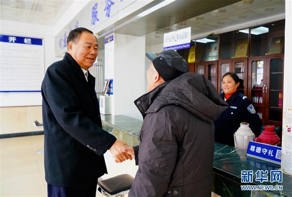12月24日,邱娥國(guó)(左)在南昌市筷子巷派出所向一位前來(lái)辦事的居民問(wèn)好。 新華社記者 胡晨歡 攝