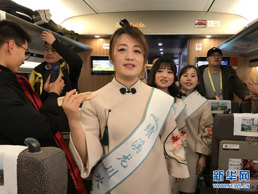 “前世不修,生在徽州;十三四歲,往外一丟?!卑不湛?jī)溪龍川景區(qū)工作人員在車廂內(nèi)演唱民謠,講述曾經(jīng)徽州人到余杭經(jīng)商做學(xué)徒走徽杭古道的艱難不易。如今,兩地旅行時(shí)間只需一個(gè)半小時(shí)。新華網(wǎng) 韓家慧 攝