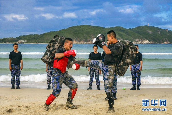海軍陸戰(zhàn)隊(duì)某旅偵察營在三亞某海域組織特戰(zhàn)隊(duì)員進(jìn)行沙灘格斗訓(xùn)練(11月21日攝)。新華社發(fā)(范旭東 攝)